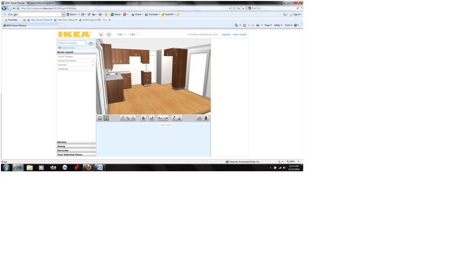 The Fridge will go next to the pantry cabinet and the range, microwave, and dishwasher in the marked spaces. The sink will actually be a D-shaped undermount with yet to be picked Corian countertops and the faucet(not the one shown) will be to the left of the sink to balance it out under the window. Not pictured are our ugly soffits that have to stay but the planner wouldn't let me put them in.